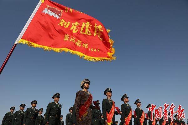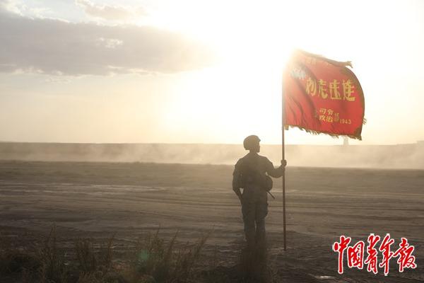 9月12日,塞北某野外駐訓(xùn)場(chǎng),夕陽(yáng)下“劉老莊連”官兵高舉“劉老莊連”榮譽(yù)旗幟。