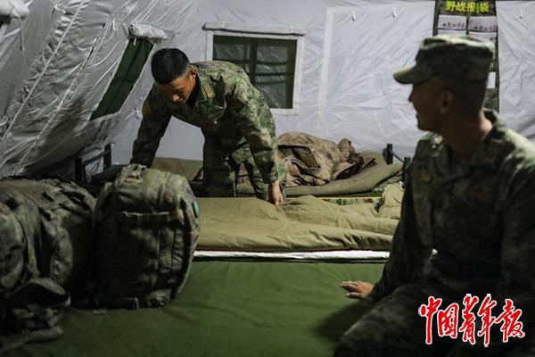 9月13日晚,塞北某野外駐訓(xùn)場(chǎng)的帳篷內(nèi),“劉老莊連”兩名戰(zhàn)士在休息時(shí)聊天。