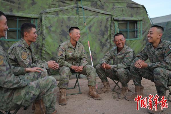 9月14日,塞北某野外駐訓(xùn)場(chǎng),“劉老莊連”的周一凡(左一)、易志宏(左二)、李柄璋(左三)、朱肖杰(右二)、王麟虎(右一)在帳篷旁聊天分享這一年彼此的生活。他們都是去年9月入伍的同年兵,軍旅生活剛滿1年。這一年,他們之中有人參加了九三閱兵,有人代表連隊(duì)登上《感動(dòng)中國(guó)》的舞臺(tái),有人在提前選晉考核中名列前茅,晉升了軍士。