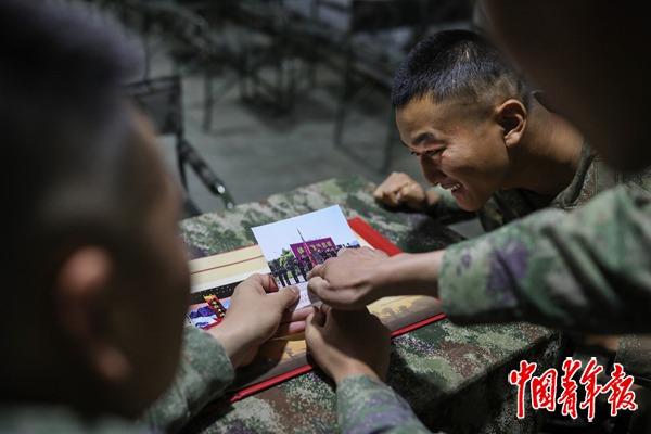 9月13日晚,塞北某野外駐訓(xùn)場(chǎng),“劉老莊連”戰(zhàn)士王熙煒(右一)在觀看連隊(duì)里參加紀(jì)念中國(guó)人民抗日戰(zhàn)爭(zhēng)暨世界反法西斯戰(zhàn)爭(zhēng)勝利80周年閱兵式的戰(zhàn)友拍攝的合影。