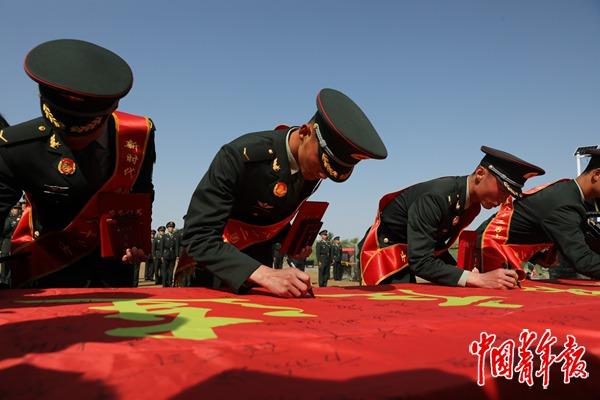 9月15日,塞北某野外駐訓(xùn)場(chǎng),“新時(shí)代劉老莊八十二勇士”頒授儀式現(xiàn)場(chǎng),被評(píng)為“新時(shí)代劉老莊八十二勇士”的11位官兵依次在勇士旗上簽名。